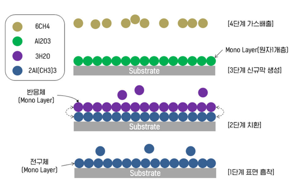 위 사진은 일반적인 TMA, H2O를 이용한 Al2O3 박막 증착과정인데, Precursor와 Reactant를 주입하는 과정 사이사이에 Purge gas를 주입하여 불순물과 흡착되지 못한 분자를 날려보냅니다. 이때 진공이 잘 잡혀있어야 국소적으로 불순물이 남지 않고 공정을 진행할 수 있으며, Precursor와 Reactant를 주입할 때도 균일하게 분자들이 흡착되게 영향을 주는 것이 진공입니다.
